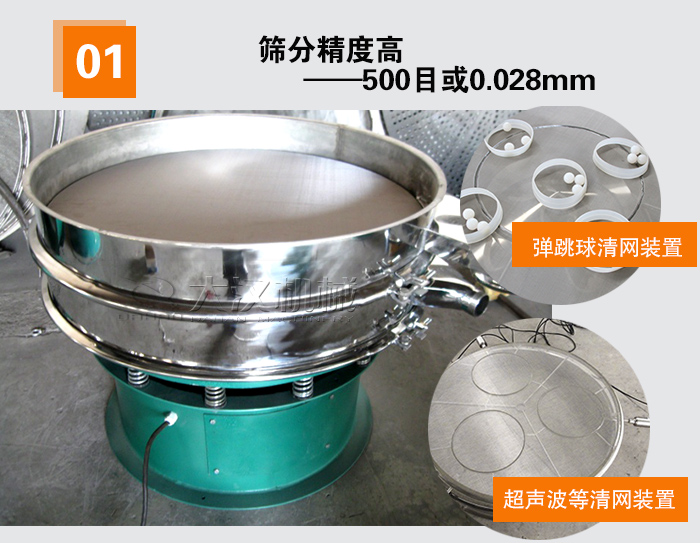 旋振篩篩分物料范圍廣,500目或0.028mm的顆粒及粉狀物料均可以高效篩分,另外,我們廠家生產(chǎn)的旋振篩設(shè)備還設(shè)置有彈跳球、超聲波等清網(wǎng)裝置,針對有些精細(xì)粉狀物料,我們的旋振篩設(shè)備可以很好地降低粉狀物料因靜電,比重輕等因素造成的堵塞網(wǎng)孔的現(xiàn)象。