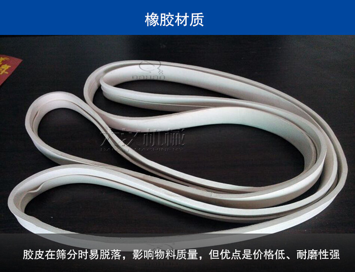 橡膠材質(zhì)的密封件中使用廣泛,,但在食品、化工類行業(yè)使用較少,因為橡膠本身對于物料會有一定的污染成分,膠皮在篩分時易脫落,會嚴重影響物料質(zhì)量,但其價格低、耐磨性強,用戶在購買振動篩應根據(jù)物料的不同要求安裝合適的密封件。