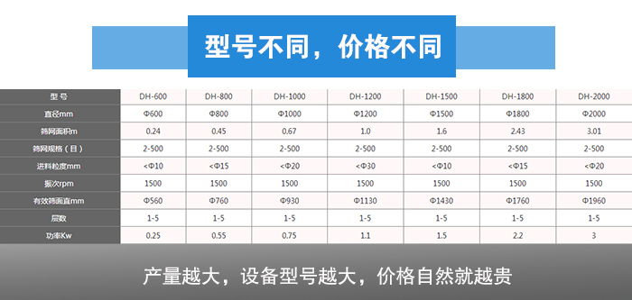 用戶對于面粉篩分產(chǎn)量的要求就決定這不銹鋼旋振篩的價格,而篩分面粉的不銹鋼旋振篩型號有DH400、DH600、DH800、DH1000、DH1200、DH1500、DH1800、DH2000等,不同型號的不銹鋼旋振篩對應(yīng)的產(chǎn)量是不同的,如果面粉的產(chǎn)量在500kg/h及以下就可以選擇DH400、DH600不銹鋼旋振篩,每小時產(chǎn)量在500-1200kg之間需要選擇DH800、DH1000、DH1200等型號,產(chǎn)量越大,設(shè)備型號越大,價格自然就越貴。