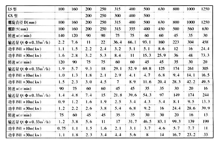 LS型、GX型螺旋輸送機主要技術(shù)參數(shù)